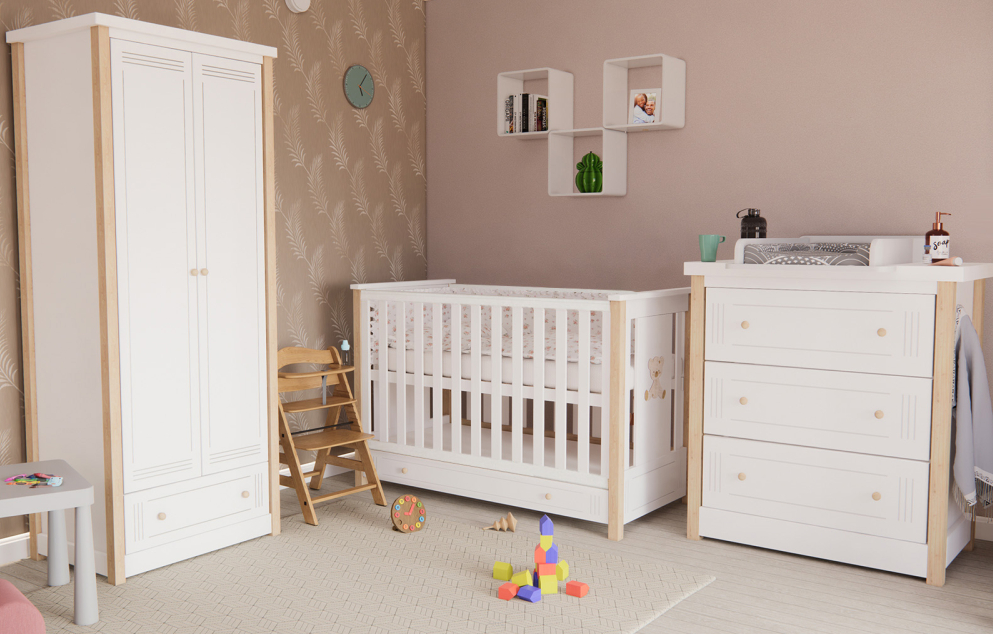 Cet ensemble de meubles pour chambre de bébé comprend un lit bébé évolutif avec 2 tiroirs, une commode avec table à langer et une armoire deux portes, pour aménager une chambre complète, fonctionnelle et harmonieuse.